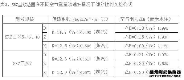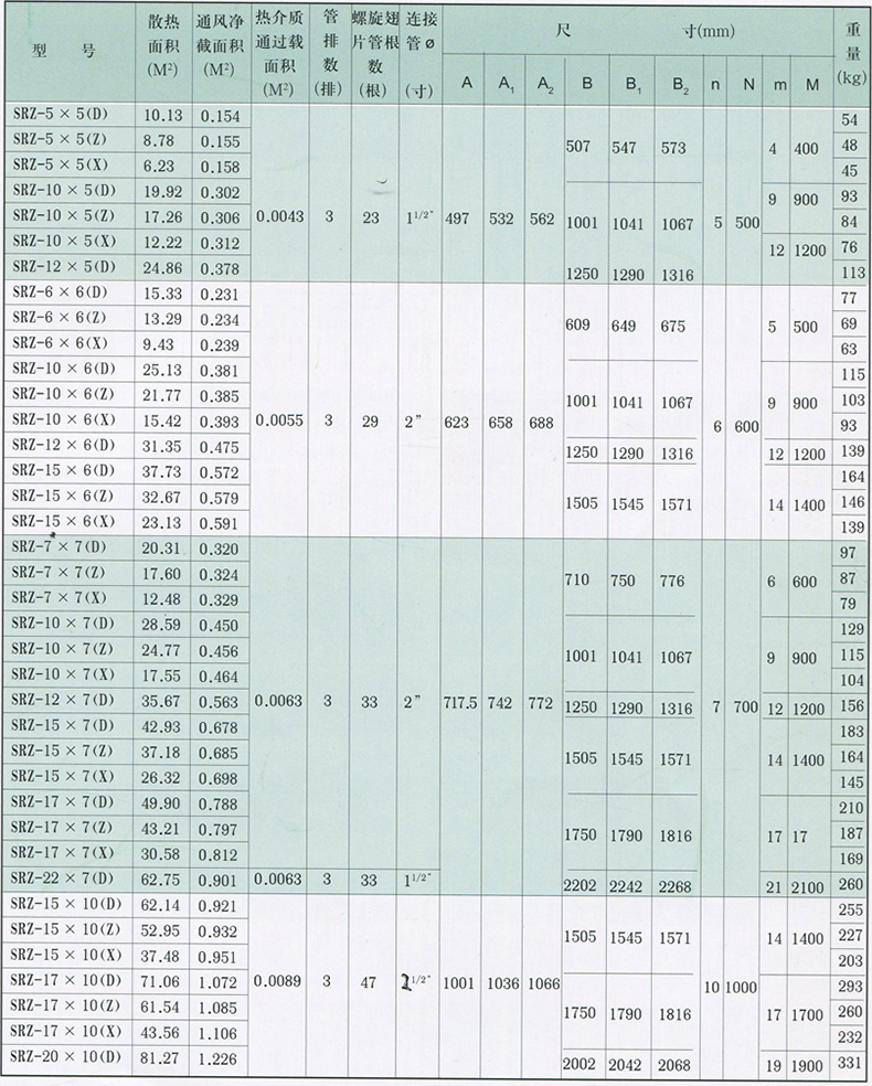 2.SRZ散熱器主要由順空氣流向的三排散熱管束組成,叉排排列,SRZ散熱器翅片管均用Ф22× 2mm無(wú)縫鋼管繞制上16×0.5mm皺折鋼帶而成,呈螺旋狀,SRZ鋼制散熱器片距有5mm-大“D”,6mm-中“Z”、8mm-小“X” 三類(lèi),共三十八種規(guī)格;