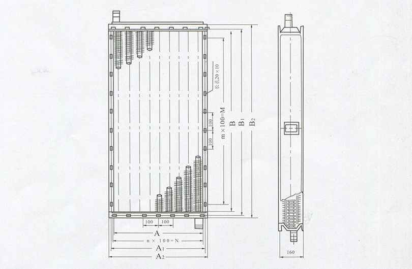 示例說明:SRZ-12×7即表示一臺SRZ型鋼管繞片盤管(散熱器),其通風(fēng)截面的長為1250mm,寬717.5mm,肋片間距為5mm。